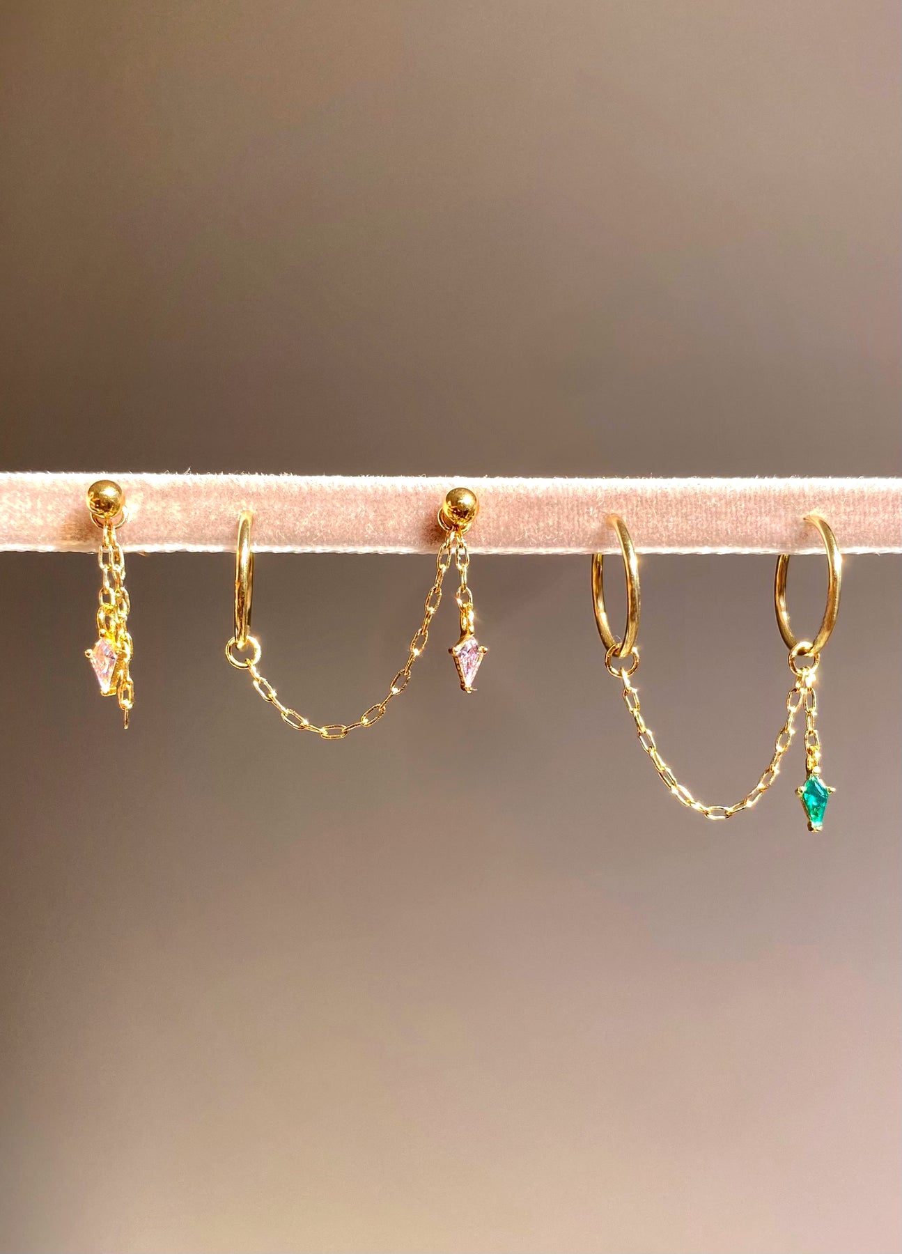 - Available with:3mm 14K Gold-filled Ball Studs12mm 14K Gold-filled Hoops- Hoop style: Sleeper - Easy to slide onto Hoops & Studs- Material: 14K Gold-filled Chain- Jump ring size: 2mm diameter- Chain length: 30mm- Charm: Sterling Silver Kite charm plated with 14K Gold, featuring sparkling kite shaped CZ stones — available in Emerald Green and Light Pink